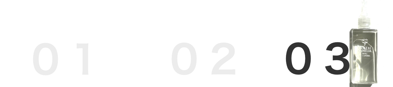 肌に水分を充分残して(バスタオルで軽くおさえる程度)クリスタルカメリアオイルを全身に伸ばします。。